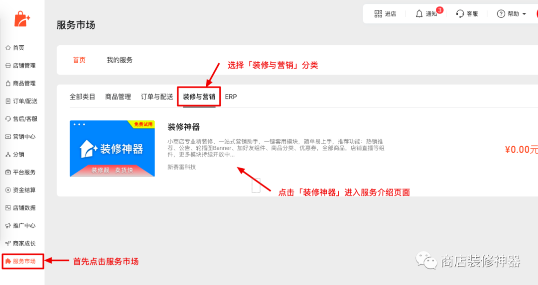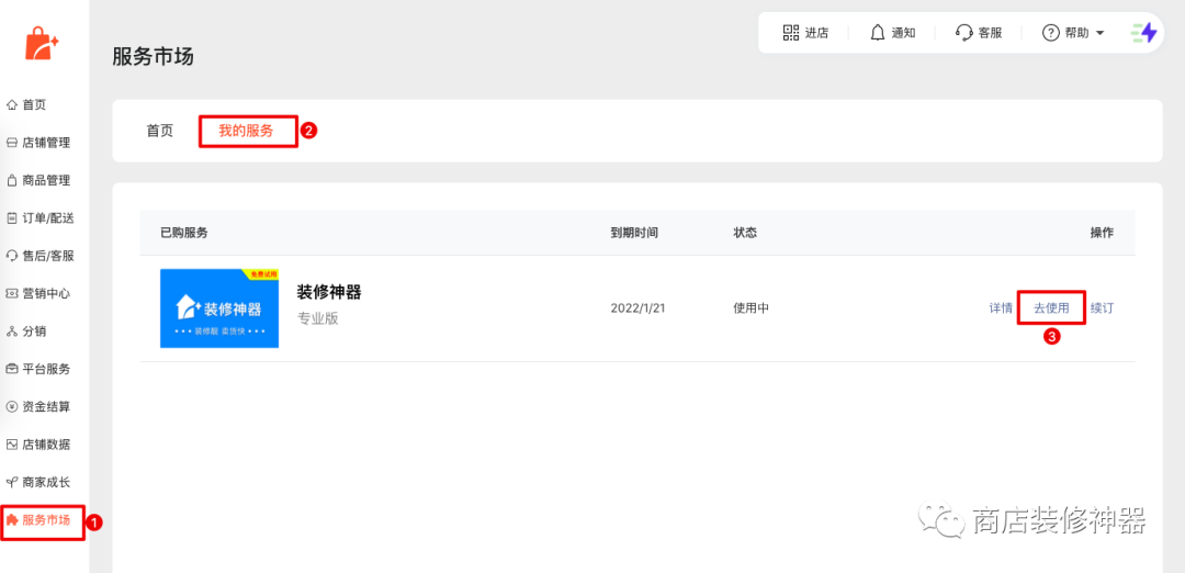 在小商店后台,进入菜单「服务市场」 -> 「我的服务」 ,点击装修神器的「去使用」按钮。