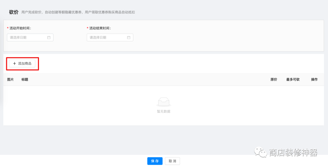 点击「添加砍价活动」按钮,进入创建砍价页面,输入活动开始和结束时间。