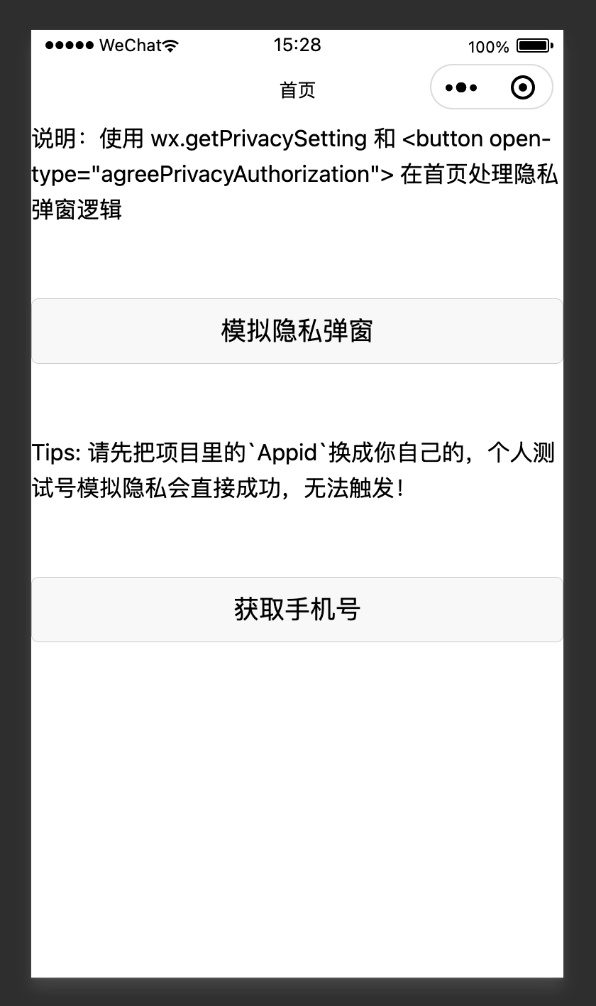 官方demo1基础上改的,用模拟隐私接口,省得还要配置,甚至后台开通的接口。复制到实际应用中,再改成用到的接口。