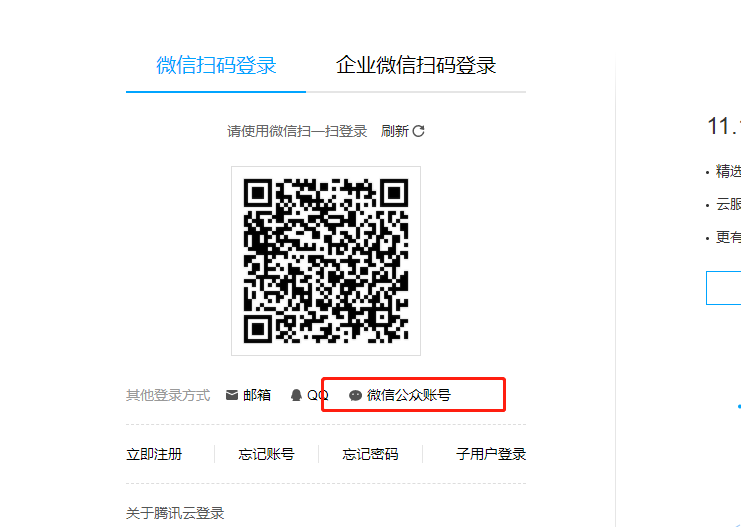 1,打开腾讯云,登录方式选择微信公众号(小程序管理员扫码),选中小程序授权登录