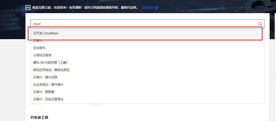 2,搜索并打开云开发CloudBase,点击对应的小程序环境
