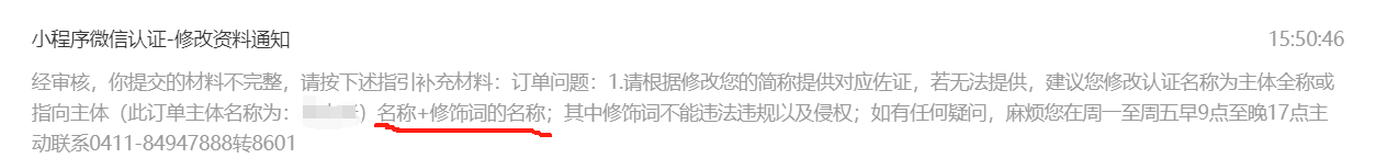 有网友遇到小程序名称被判定不合规,被官方建议改成主体全称(即个人姓名)或主体加修饰词的命名方式。