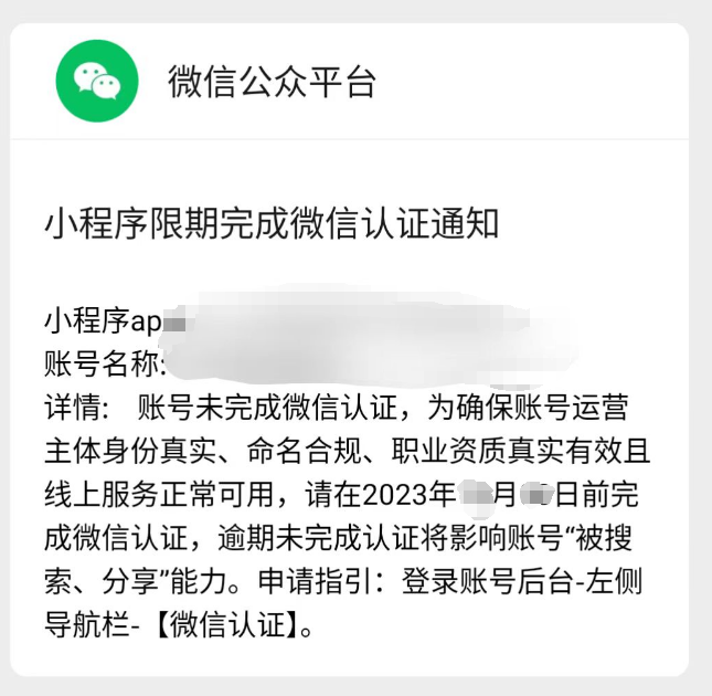 如果限期内不完成微信认证,则会限制“被搜索、分享”的能力,但不影响版本迭代。