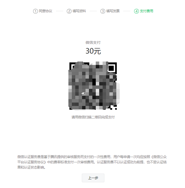 【同意协议】=》【填写资料】=》【填写发票】=》【支付费用】