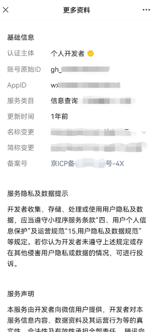 个人小程序的资料页,会出现“个人开发者”的认证,以及一个黄标认证标识。