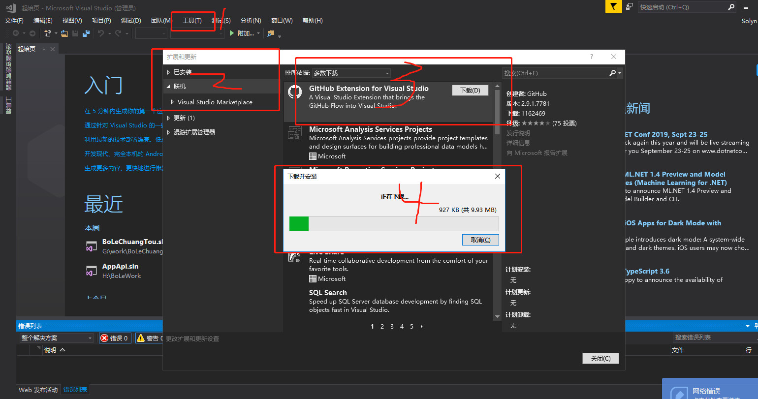 第一步,修改本地git项目的设置,因为只有这样才会被github设别为贡献者,做法是单击(团队资源管理器)的功能标签下拉菜单,选择【设置】