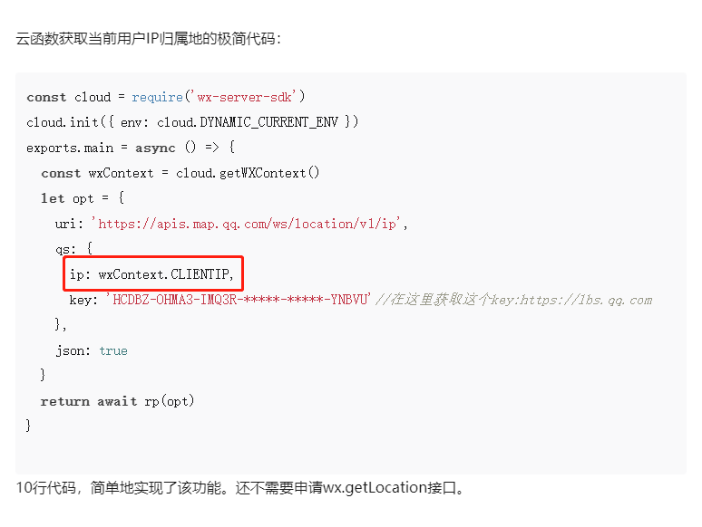 var ip = wxContext.CLIENTIP?wxContext.CLIENTIP:wxContext.CLIENTIPV6;参考文章:https://developers.weixin.qq.com/community/develop/article/doc/000e2ca85f0e5821bdedd6efb51413