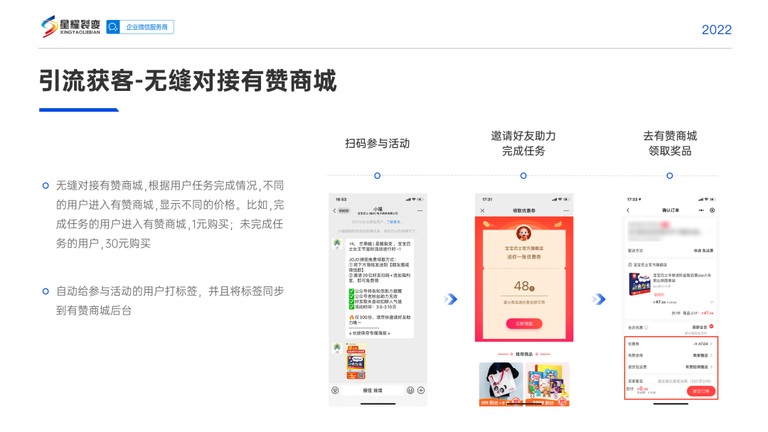 在企业微信+公众号的裂变活动中,支持无缝对接引流至有赞商城。