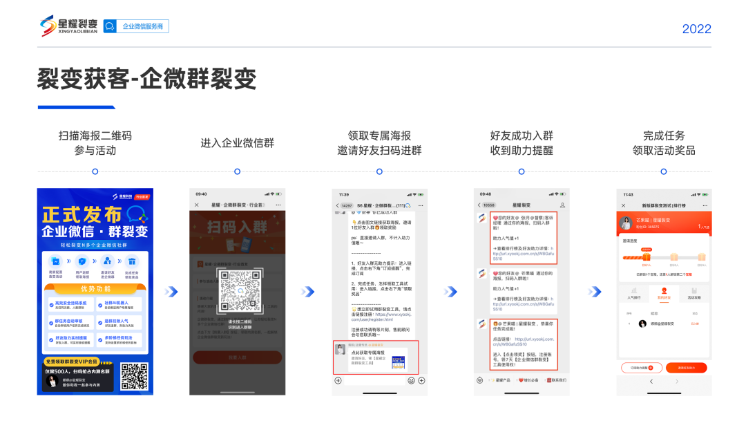 这个是裂变流程图,用户添加企业微信获取自己的专属海报,将海报分享给好友,邀请好友扫码为自己助力,助力人数达到商家指定邀请任务目标时,就可以领取活动奖品。