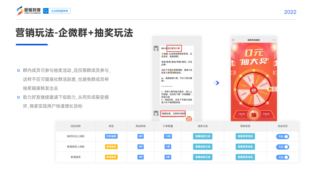 营销玩法,主要是在裂变玩法的基础上,做了一些升级,比如可以在给企微号做增长的时候,同时给社群引流,给小程序引流,给商城引流等等。