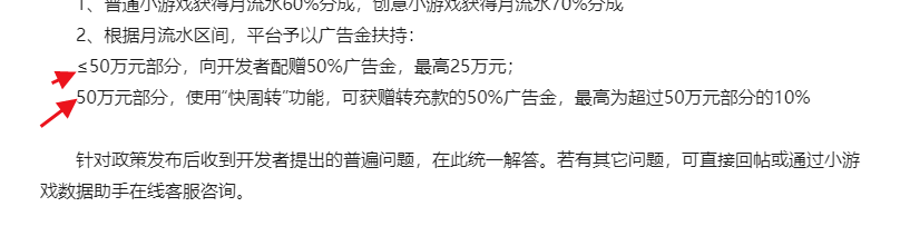 ≤50万元部分,向开发者配赠50%广告金,最高25万元;