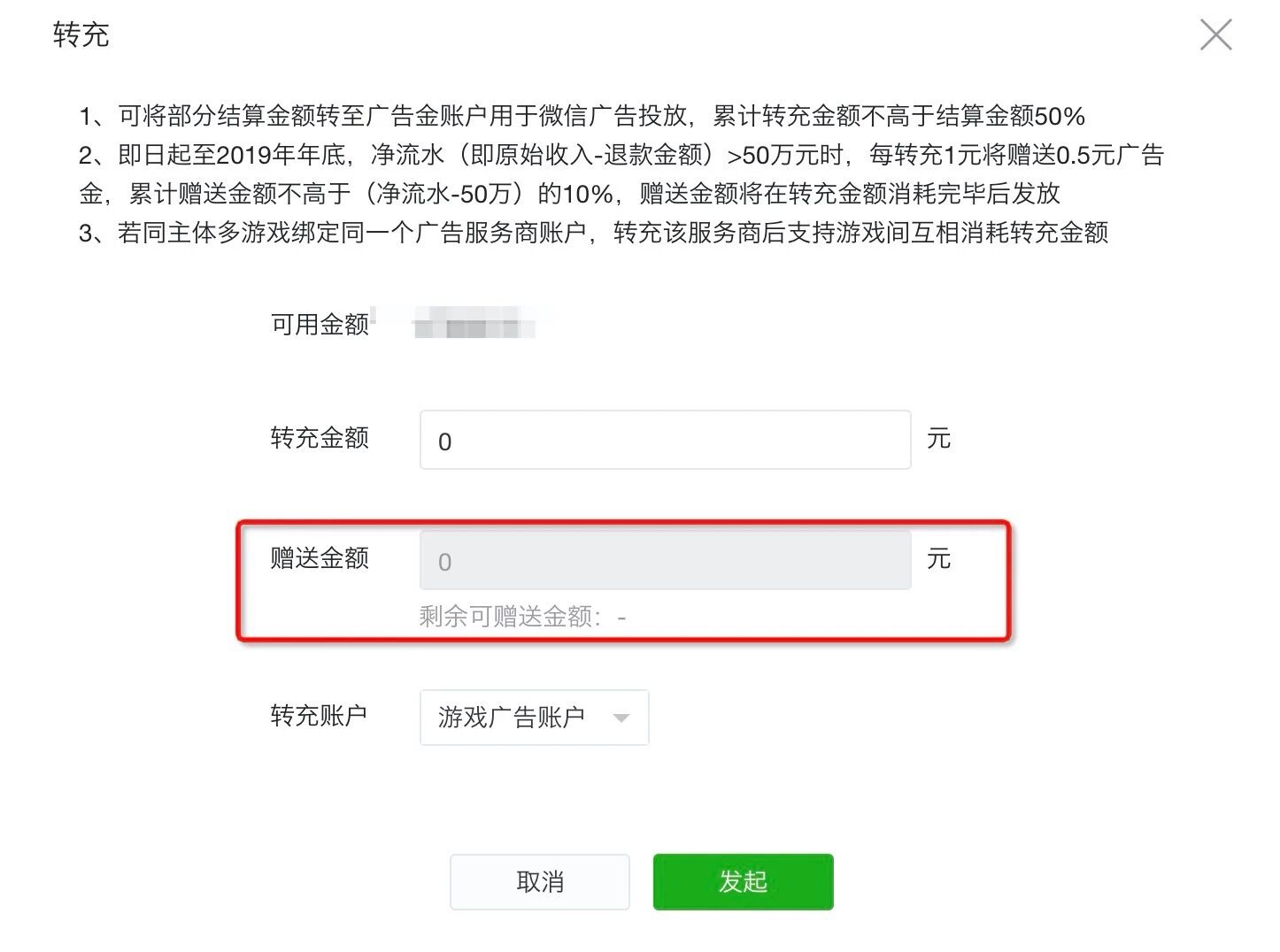 例:转充10万元对某小游戏进行广告投放,优先消耗转充的10万元。该小游戏广告现金消耗达到10万元后,配赠的5万元广告金将于第二天发放至转充对应的微信广告赠送账户中。