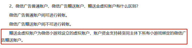 赠送金虚拟账户为微信小游戏设立的虚拟账户,账户资金支持转至同主体下所有小游戏绑定的微信广告赠送账户。