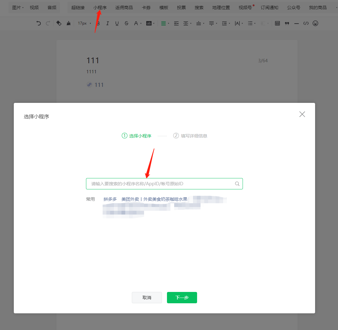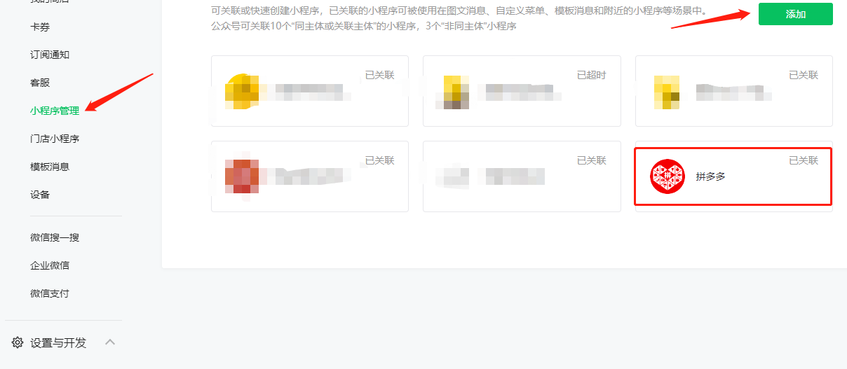 在嵌入微信公众平台的公众号菜单时候需要先将拼多多的小程序绑定至微信公众平台后台。
