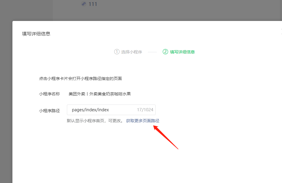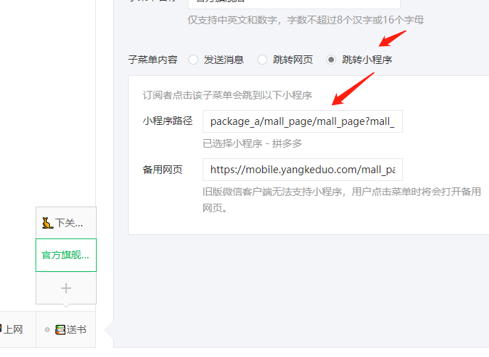 然后在微信公众菜单栏配置时候选择你刚才绑定的pdd小程序,并在页面路径中输入上述你的店铺首页程序路径即可,(上述路径请替换你的店铺id和传递口令为你自己的店铺信息 )获取方式如下
