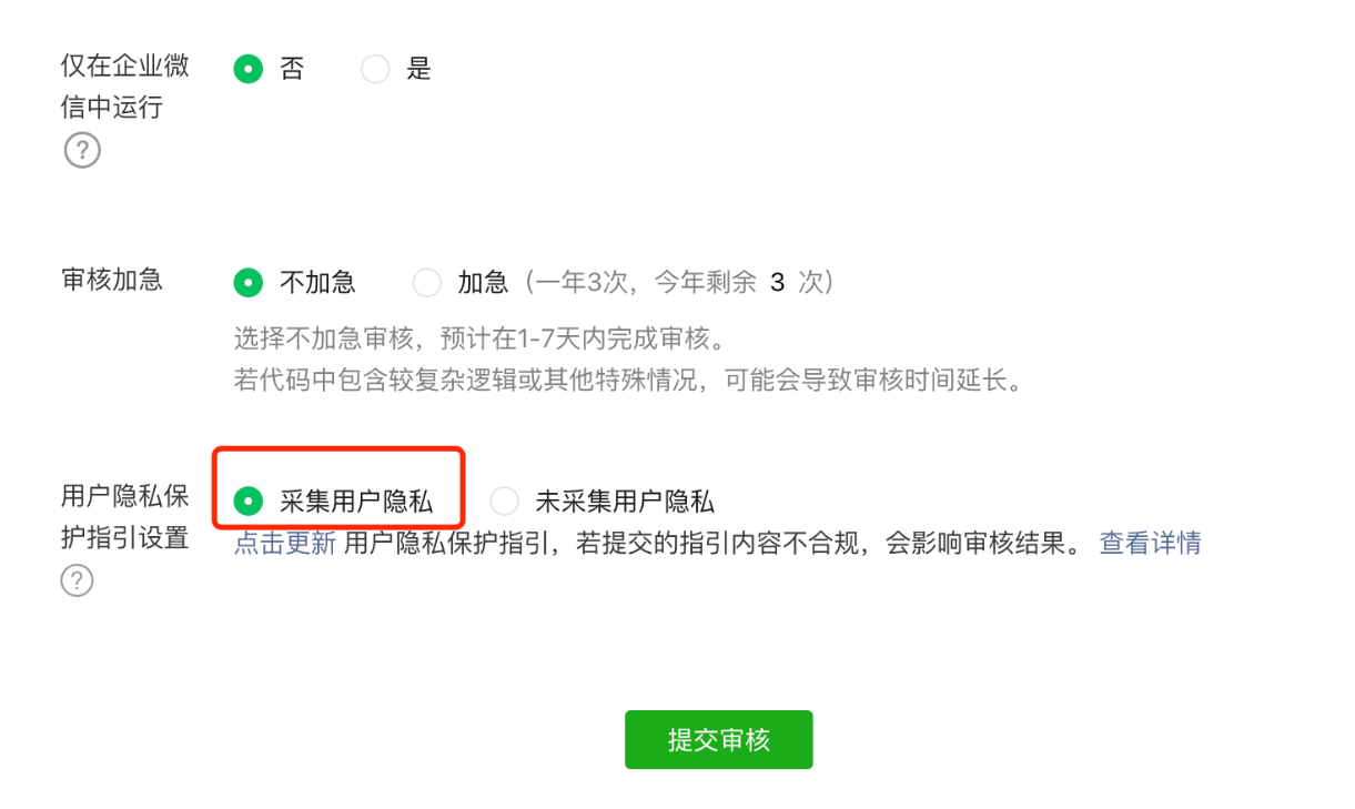 首先先完善隐私协议,然后提交审核的时候这个选项就在是否加急下方