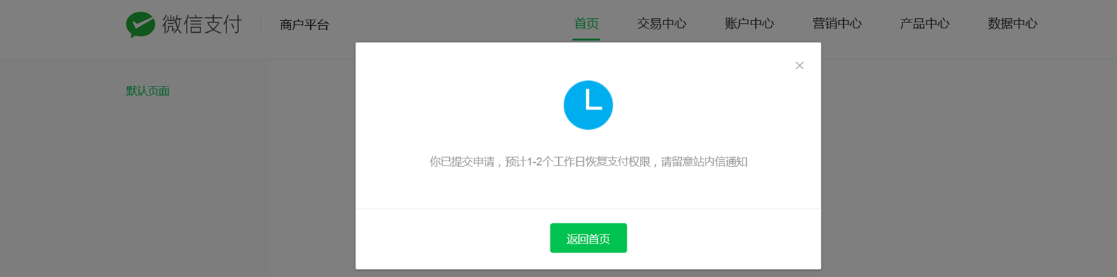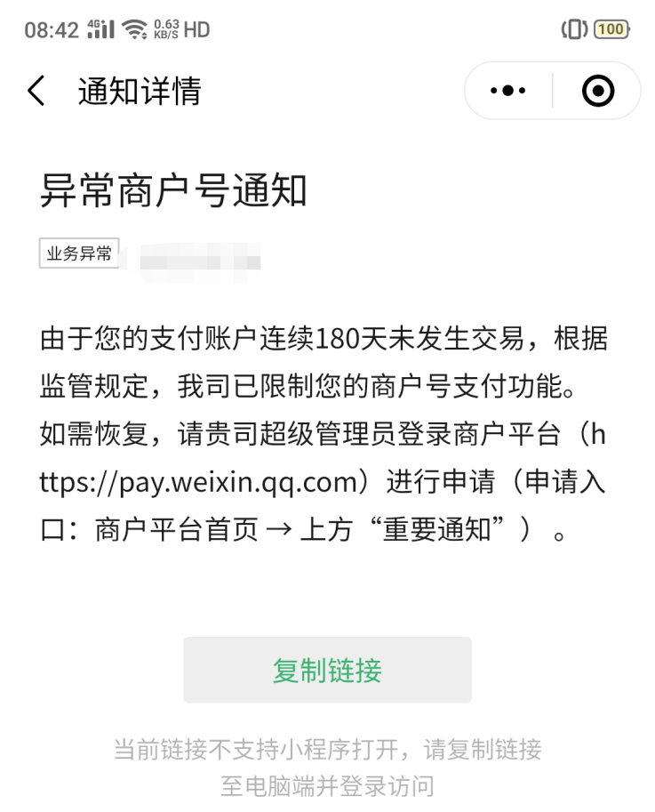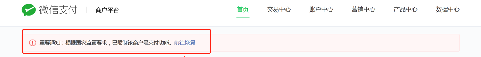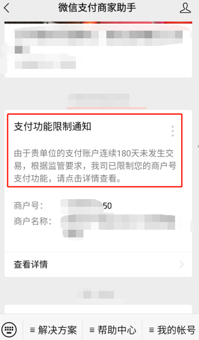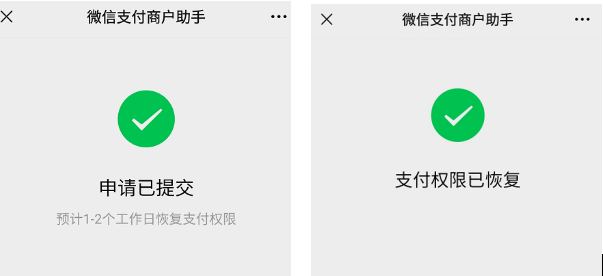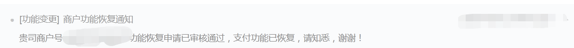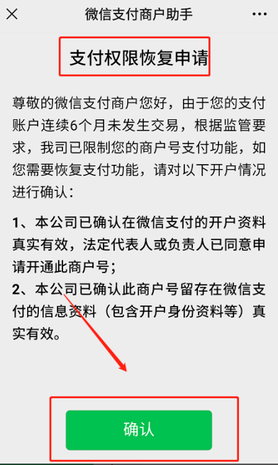 - 法人/超管在微信中收到--微信支付商家助手的--支付功能限制通知---点击查看详情—进入页面后点击确认---稍后重新打开页面,查看审核情况。