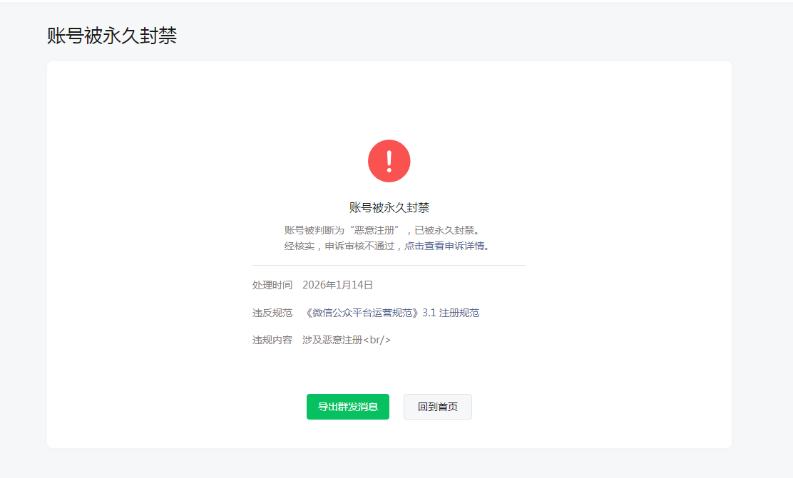 服务号提示恶意注册被封禁,申诉也未通过。主体就注册了一个服务号,俩小程序 并没有恶意注册 怎么解决?