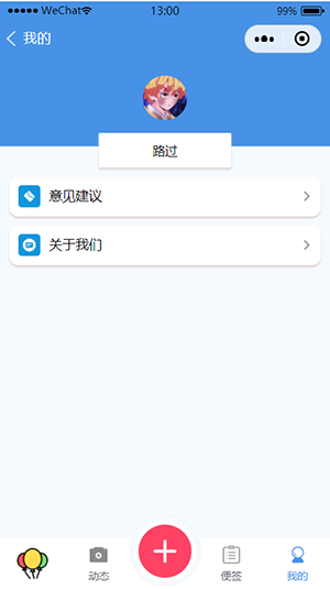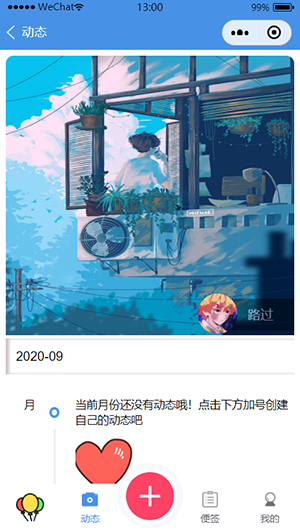 为了给用户完善的体验,因此小程序两大核心的功能是动态和便签。动态功能可使用户随时随地记录身边的美好,且支持图片上传的功能和记录坐标,而便签在生活中也是不可或缺的,用户可根据便签功能是记录某时某刻的感受,或者是设置一些生活小提示,并且可根据内容设置相对应的tag标签,以及设置那一刻心情的小图标。这些内容是只有用户一人可以浏览的,也是我们做的初衷。