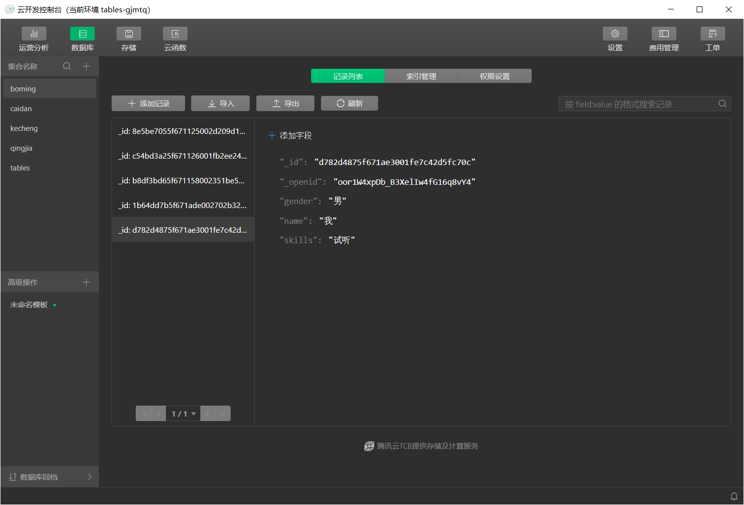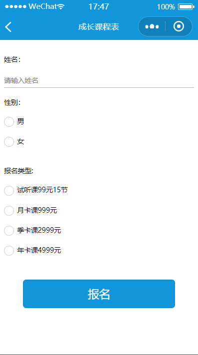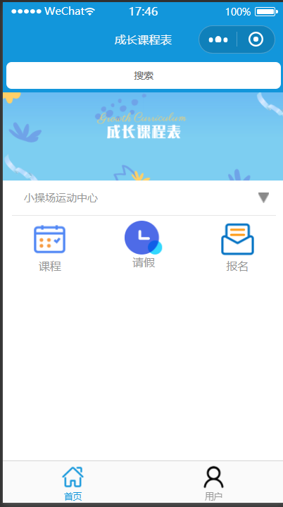 小程序主要有两个页面,一个页面是主页面,主页面有三个功能,在报名的页面内可选择报名的课程,报名成功后添加在云数据库里,在请假的页面里可选择请假,课程里可选择上课时间,本来在主页面下有一个课程表,后来由于不会,就没写。