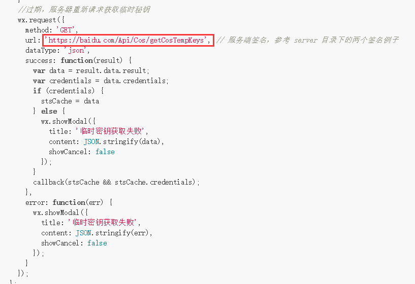 url: 'https://baidu.com/Api/Cos/getCosTempKeys', // 服务端签名,参考 server 目录下的两个签名例子