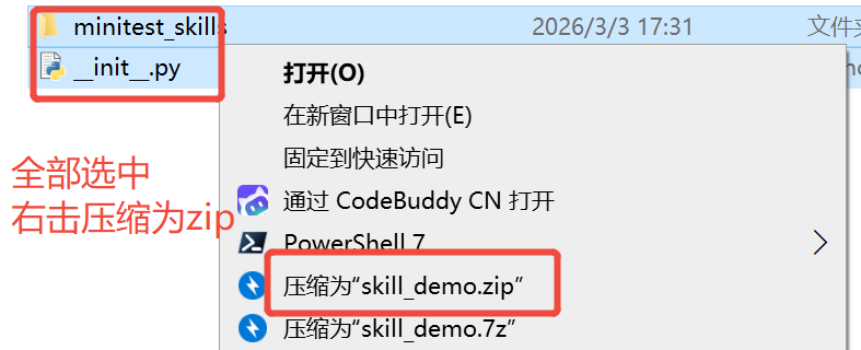 - 在minitest_skills文件夹下以及同层目录,都必须要包含__init__.py这个空文件,表示这是一个python的包(不明白的请自行搜索下python语法)