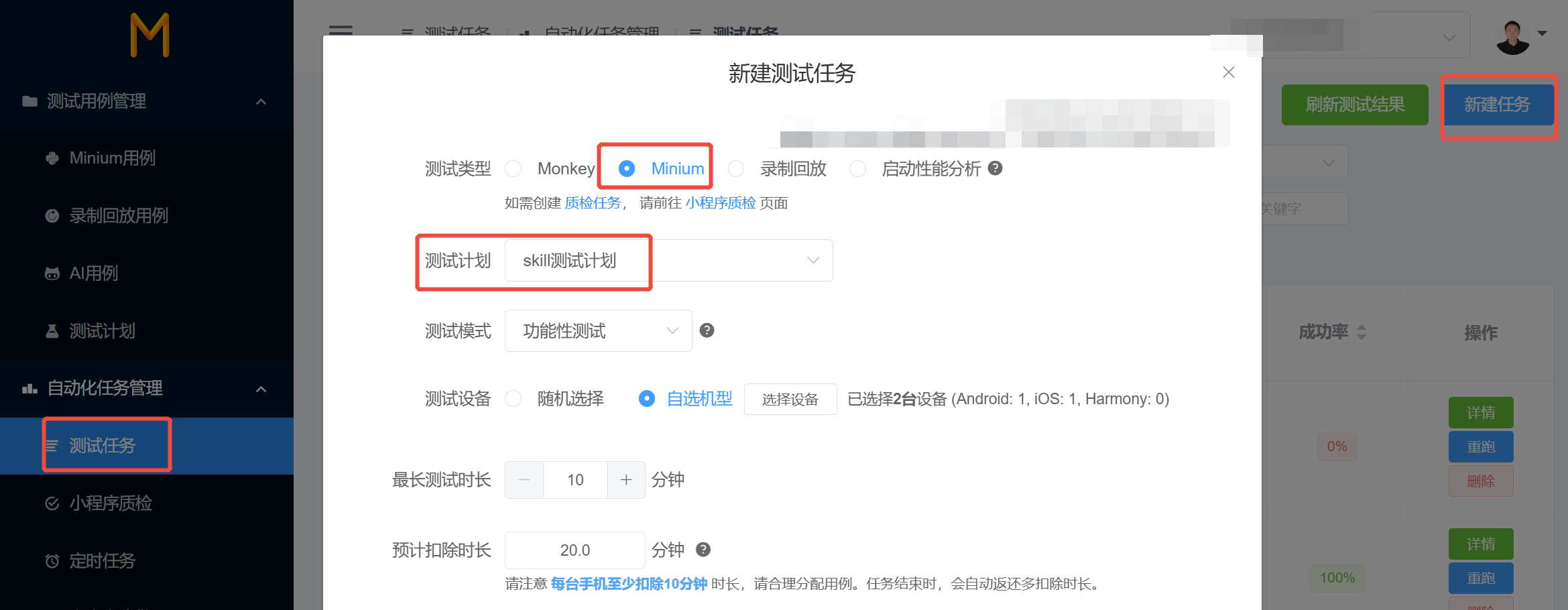 在弹出的窗口中,测试类型选择“Minium”,测试计划选择刚刚创建的计划,然后提交任务