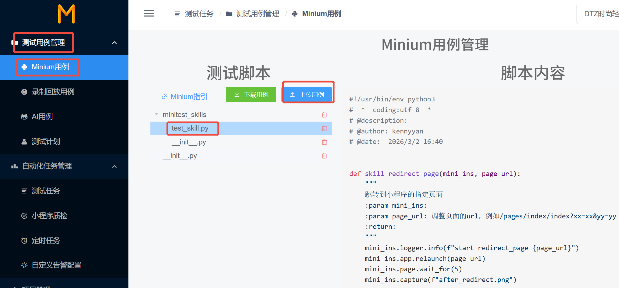 上传成功后,可以看到用例中有minitest_skills文件夹和对应的skill文件。