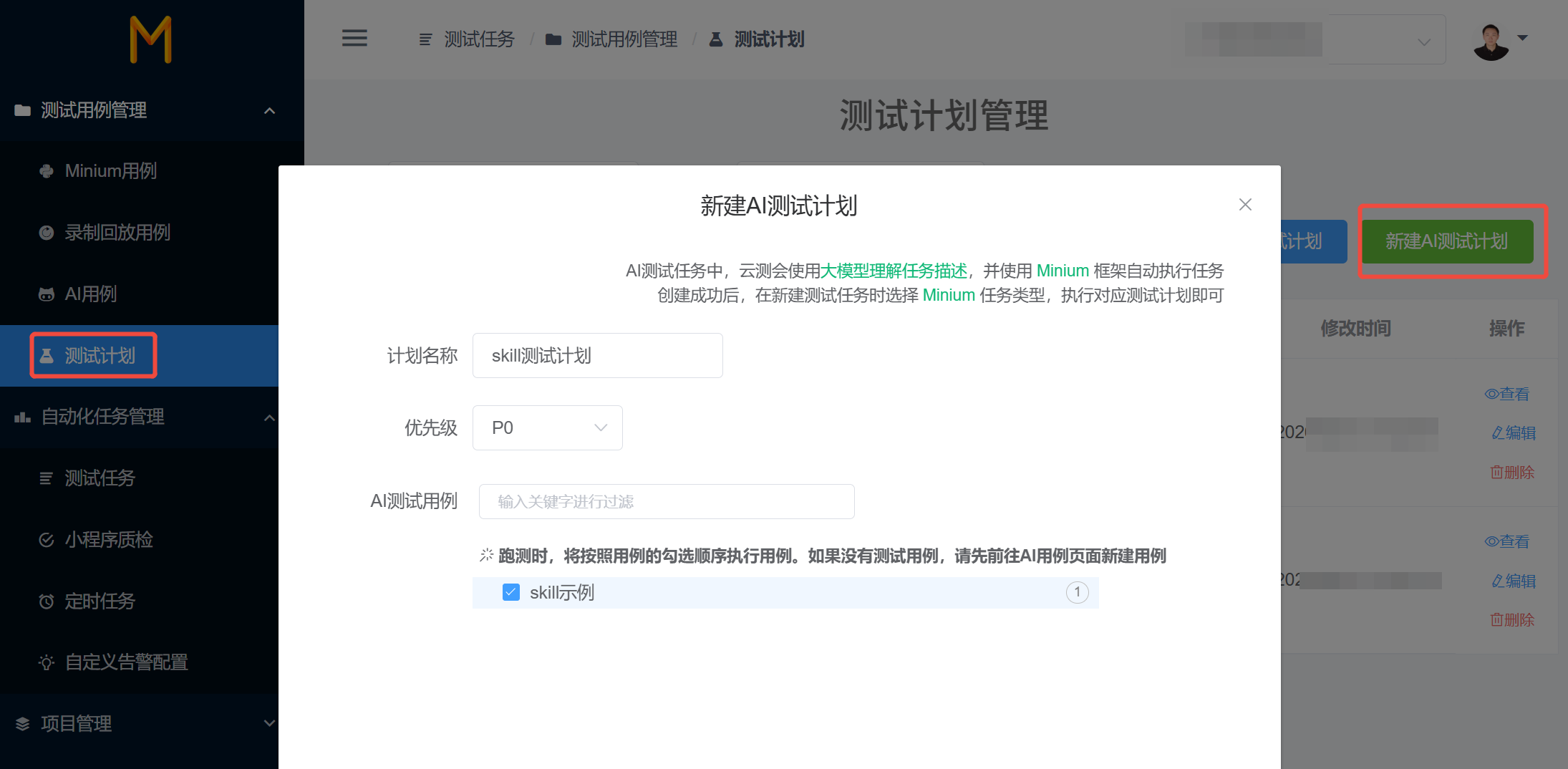 在“测试用例管理”=>“测试计划”中,点击“新建AI测试计划”,新建测试计划