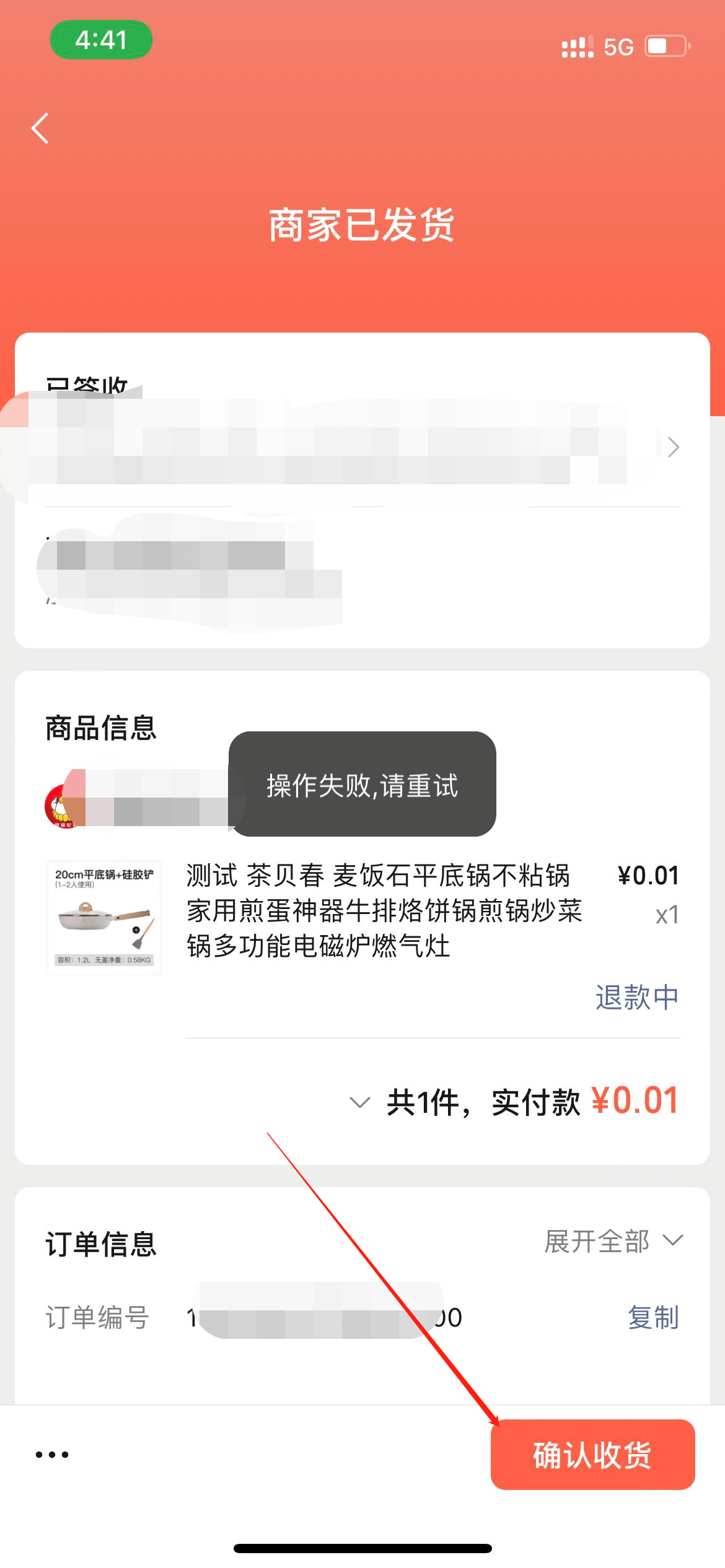 视频号订单,发起售后申请,商家拒绝后,正常发货,视频号订单中心,点击确认收货,报:操作失败,请重试