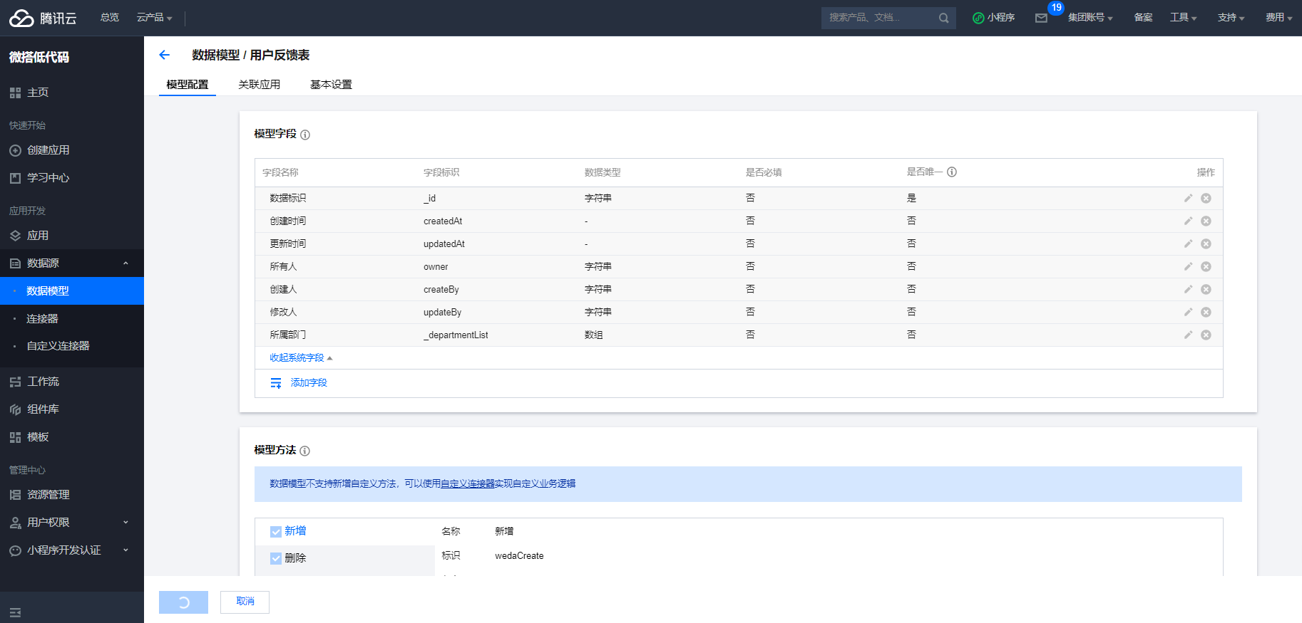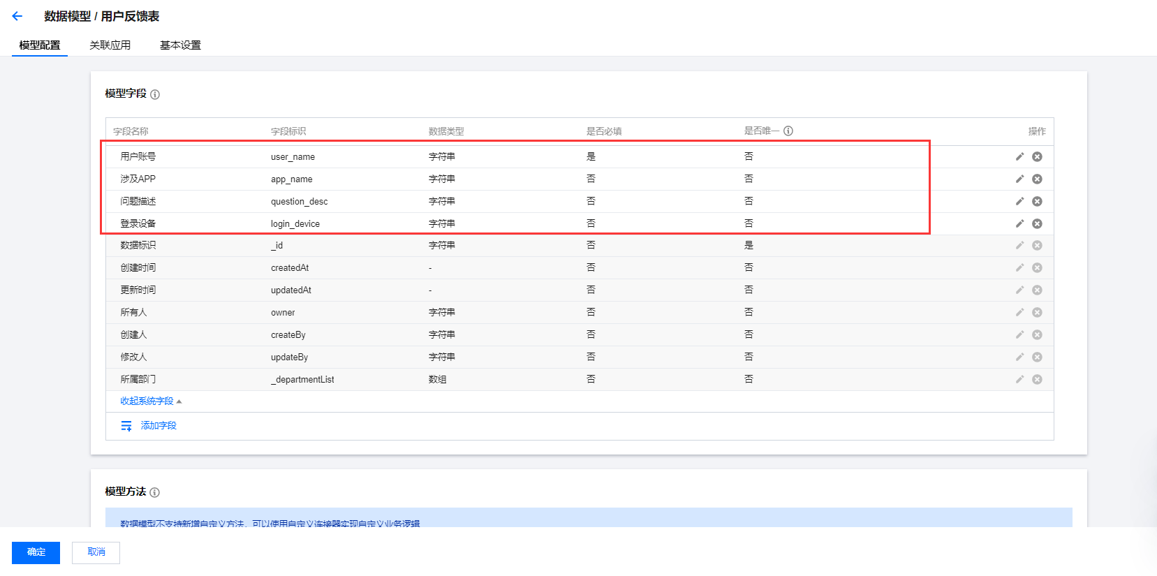 默认数据模型中有数据标识、创建时间、更新时间等系统模型字段,我们点击模型字段区域底部的“添加字段”,再增加几个。