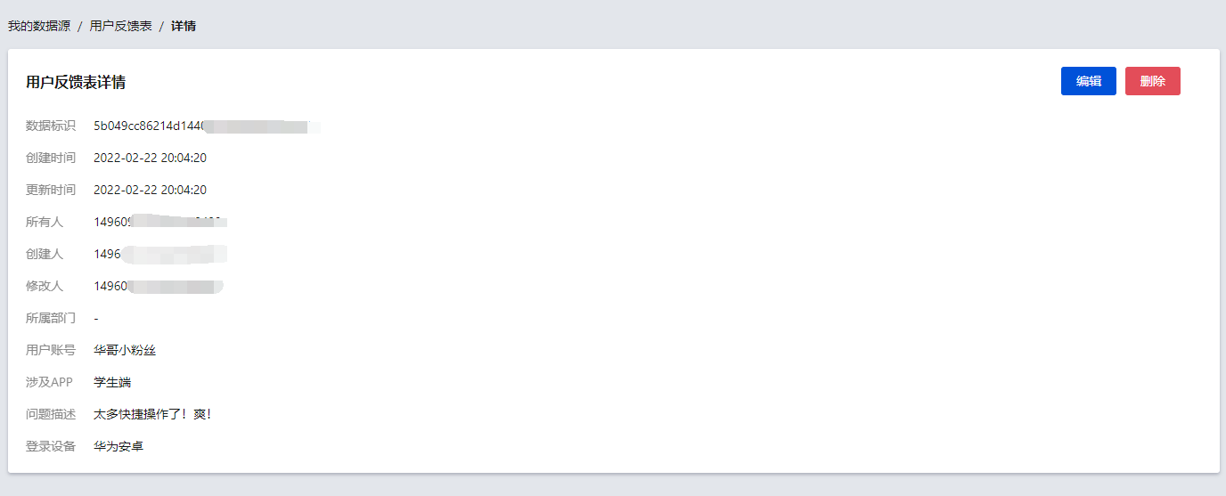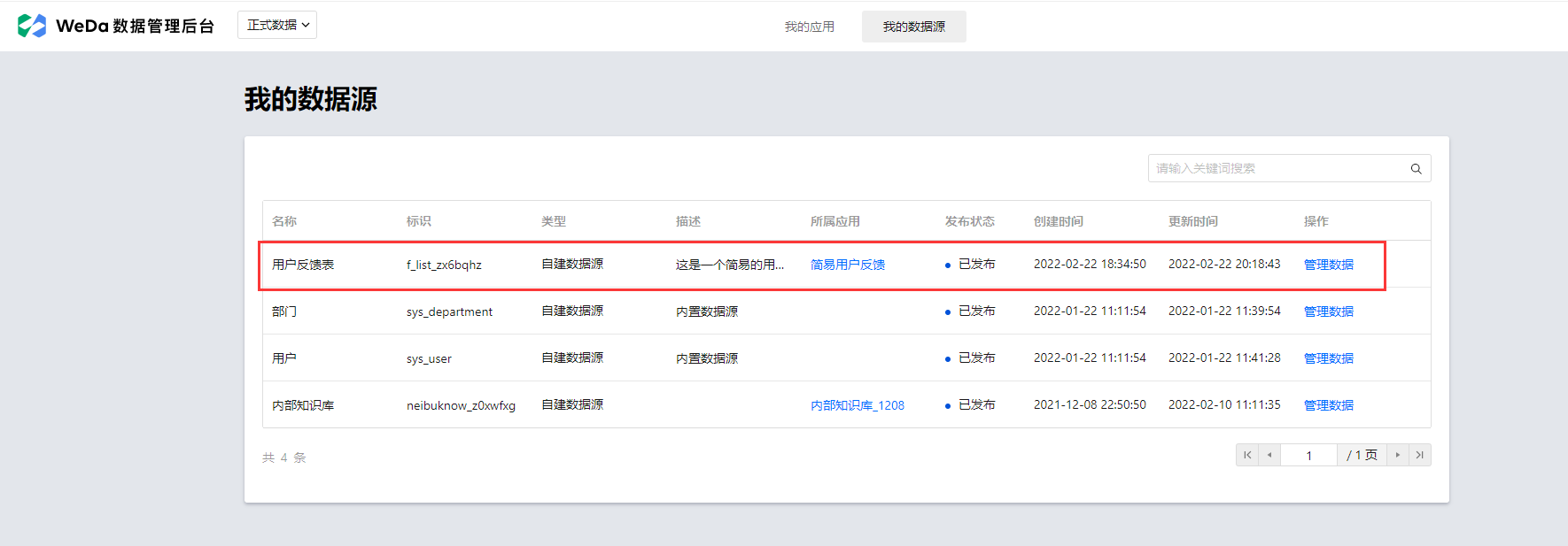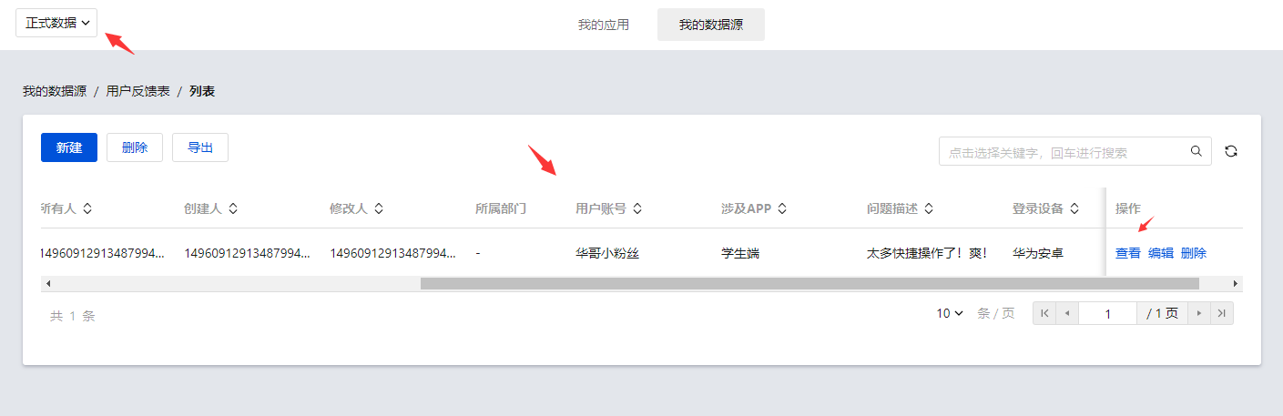 点击“用户反馈表”的管理数据,我们打开看一下刚才页面数据是否录入成功。