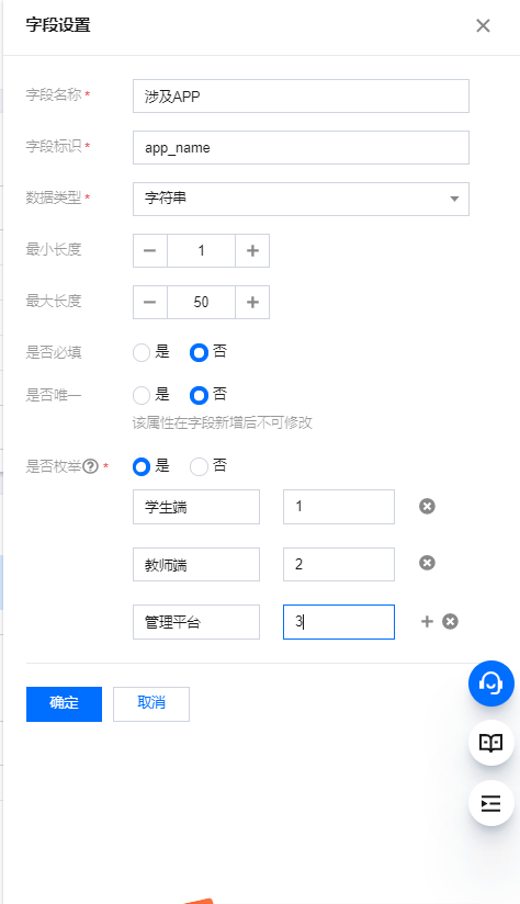设置字段名称、字段标识,选择数据类型,设置最小最大长度,设置必填,然后点击确定添加。