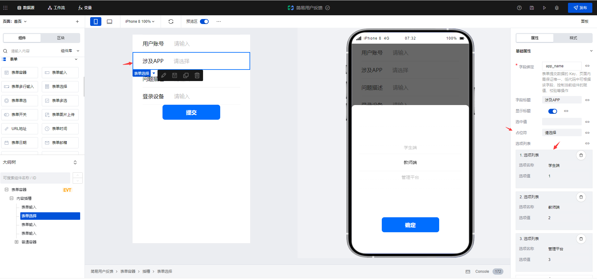 点击删除原来“涉及APP”的组件,从左侧拖拽“表单选择”到编辑区域。