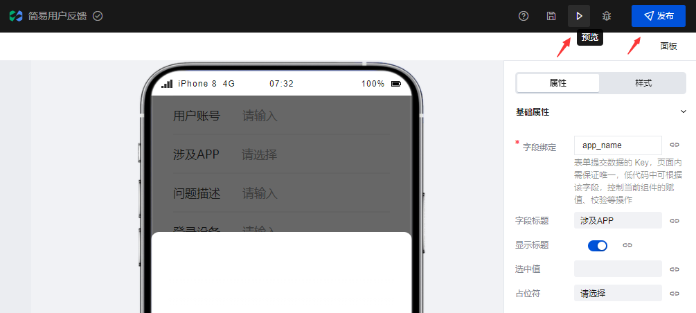 右侧属性区域,改了占位符提示以及选项列表内容(和数据字段枚举对齐)。