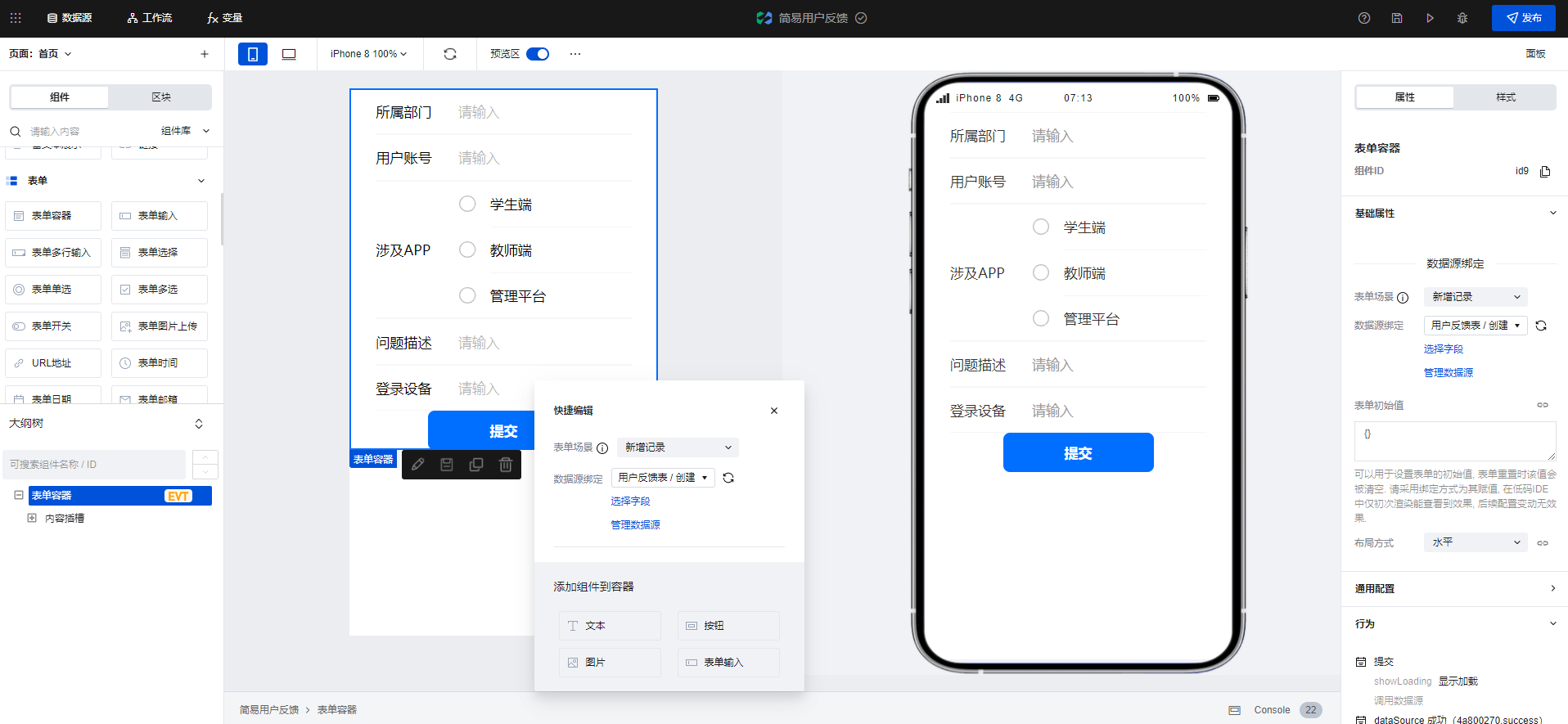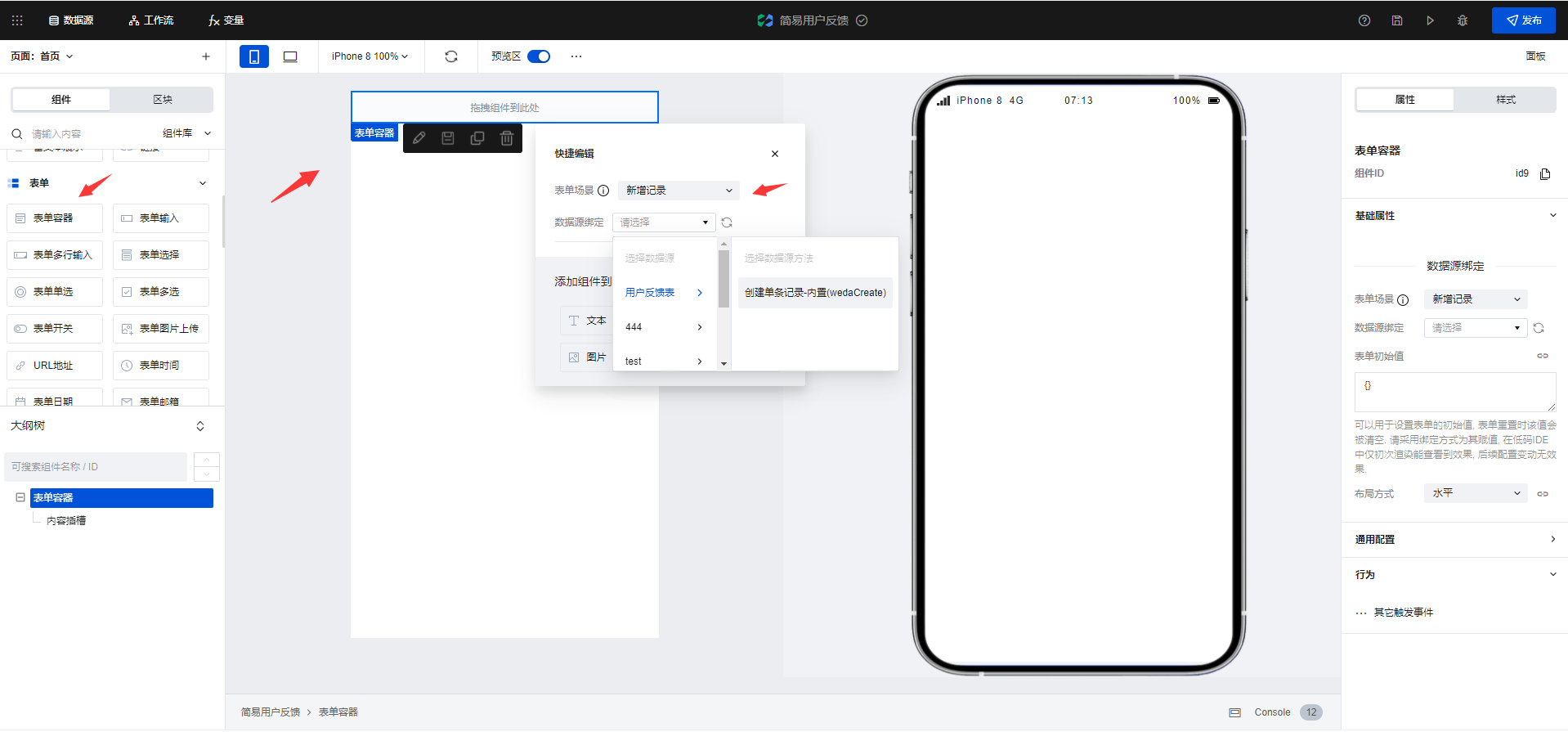 然后数据源绑定里面找到刚才新建的数据模型“用户反馈表”,选择“创建单条记录”。