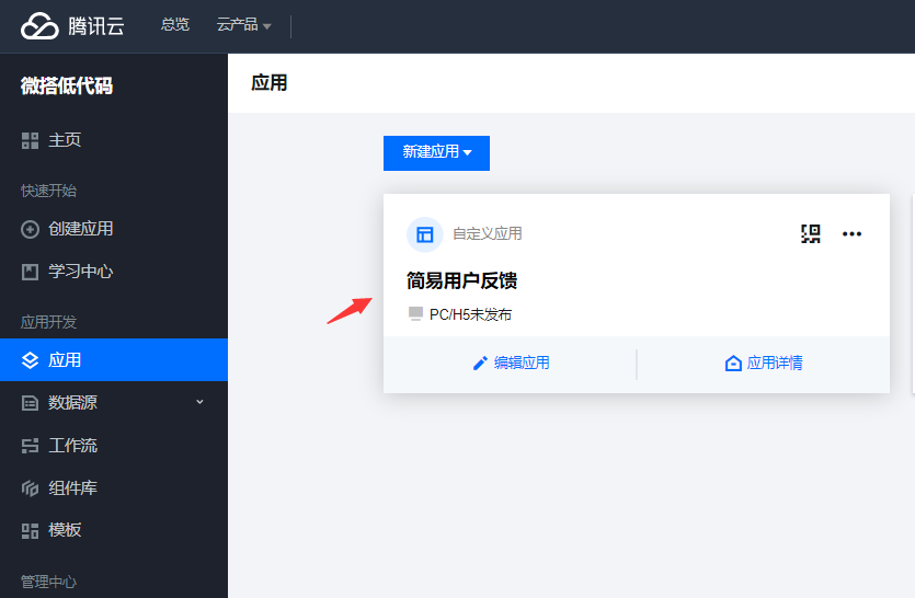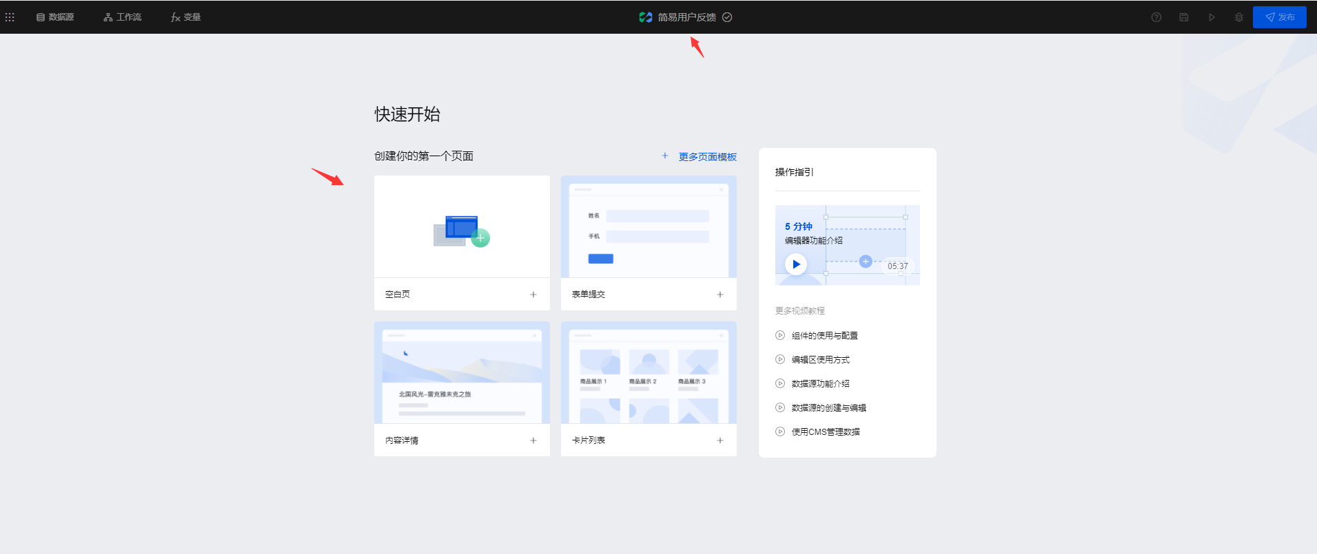 但个人习惯是先创建数据源,不着急现在就创建页面,所以让我们先回到应用首页。
