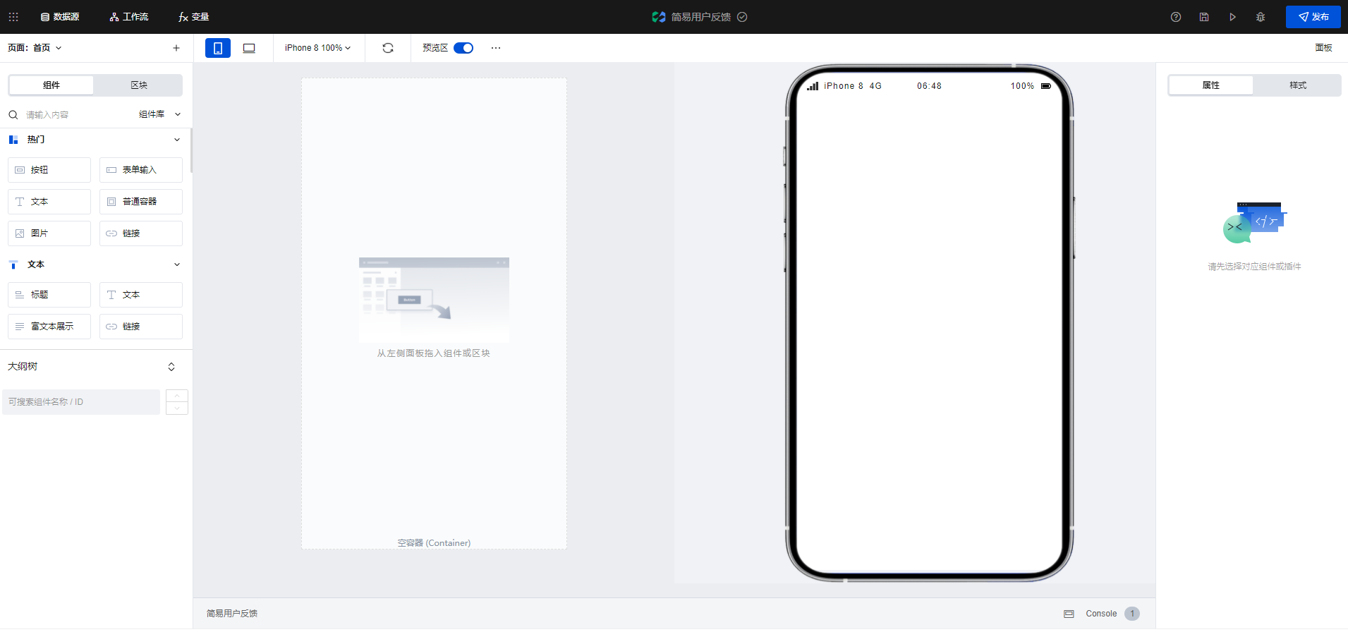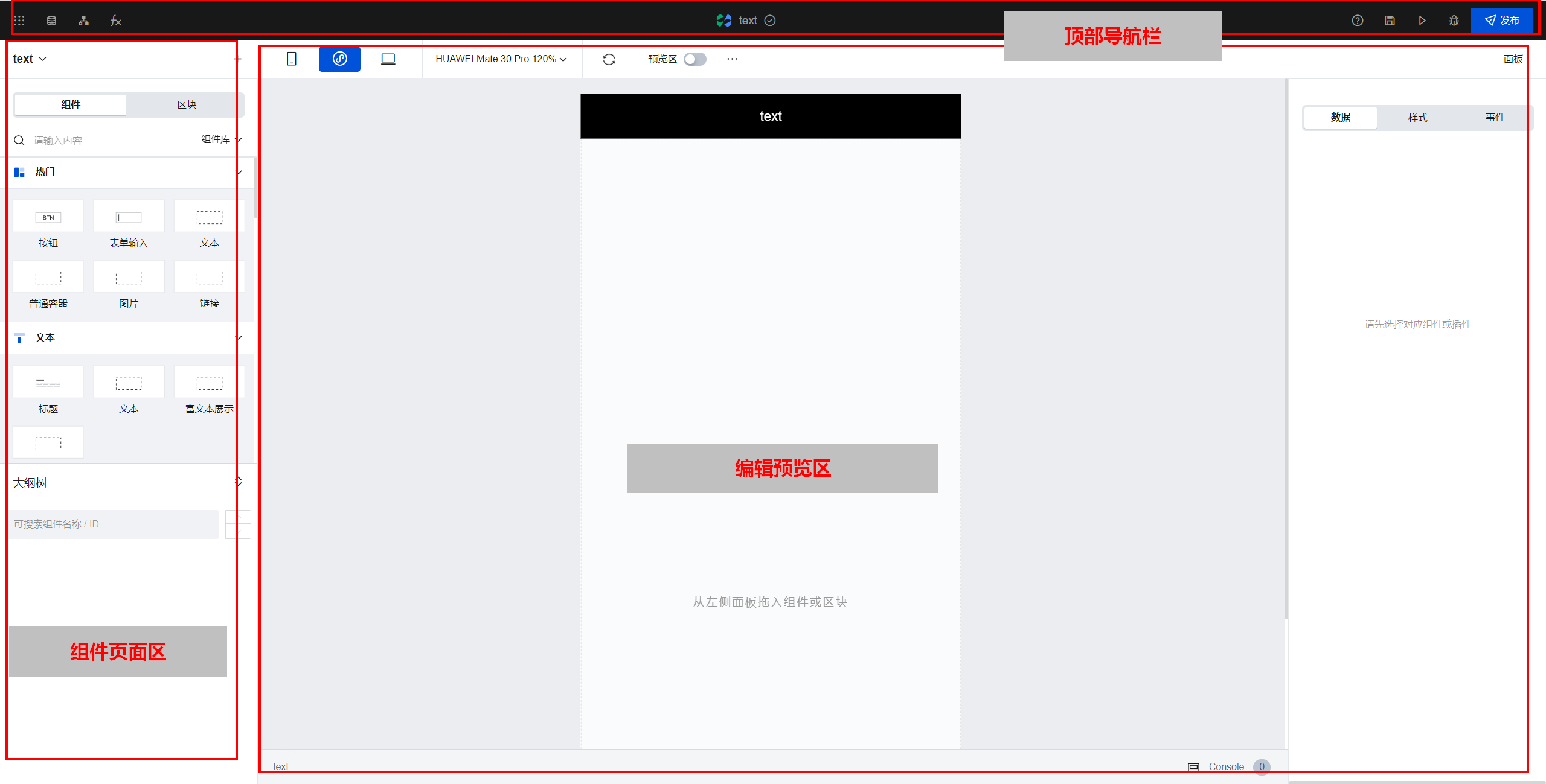 工作台主要分为三个功能区:顶部导航栏、组件页面区、编辑预览区