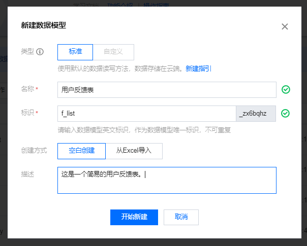 然后设置数据模型名称、标识和描述,点击开始新建按钮。