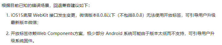 - iOS15底层 WebKit 接口发生变更,微信版本8.0.8以下(不包括8.0.8)无法使用开放标签,可引导用户升级最新版本微信;