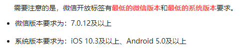 需要注意的是,微信开放标签有最低的微信版本和最低的系统版本要求。