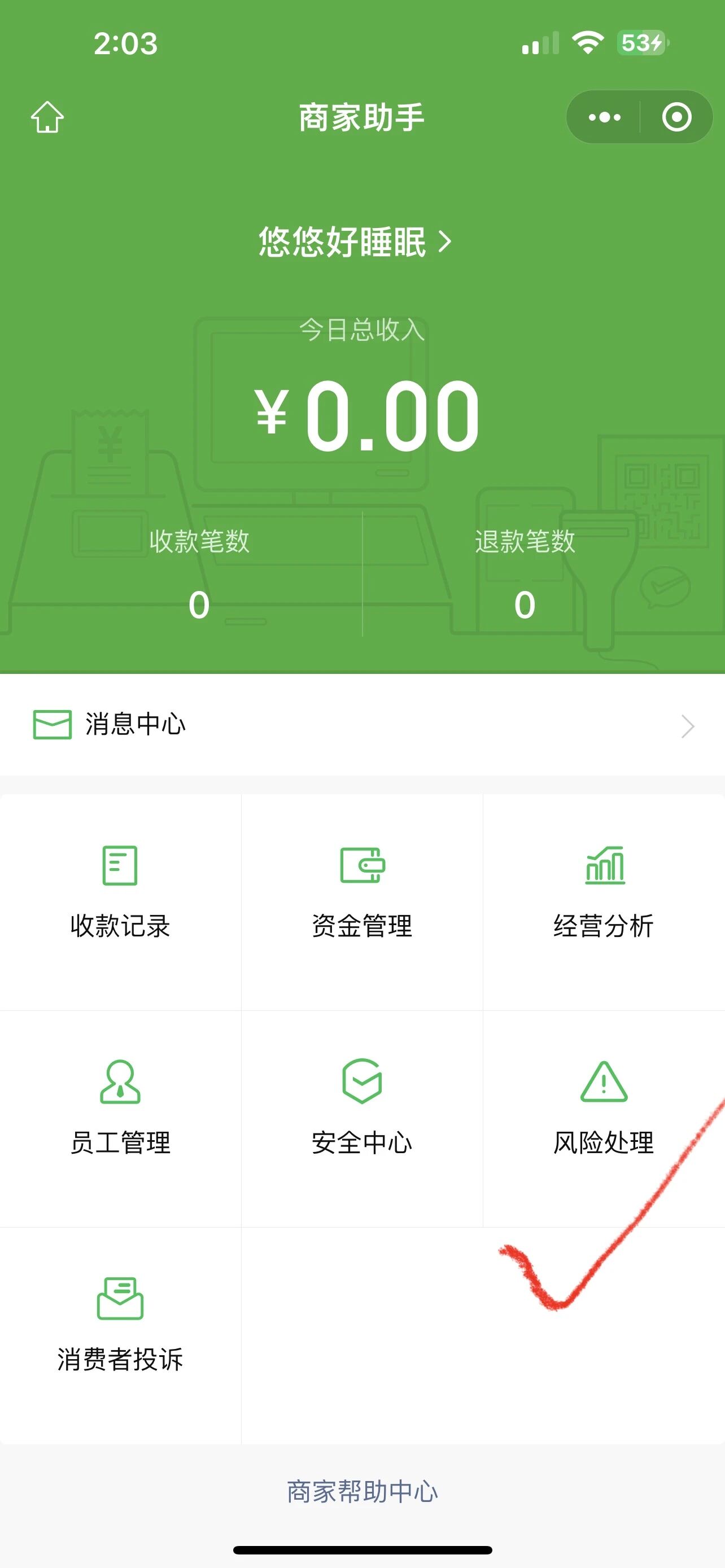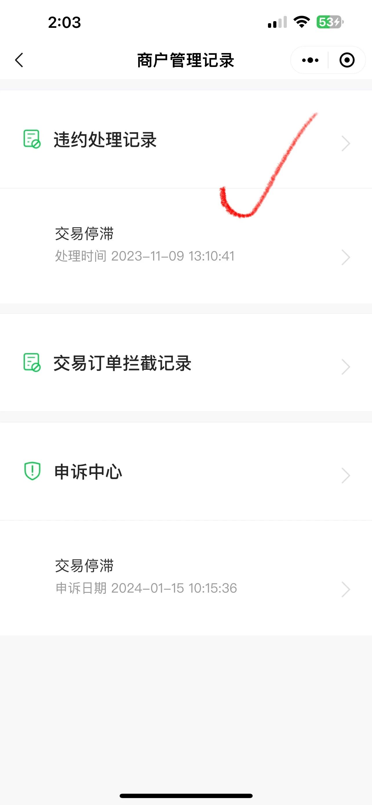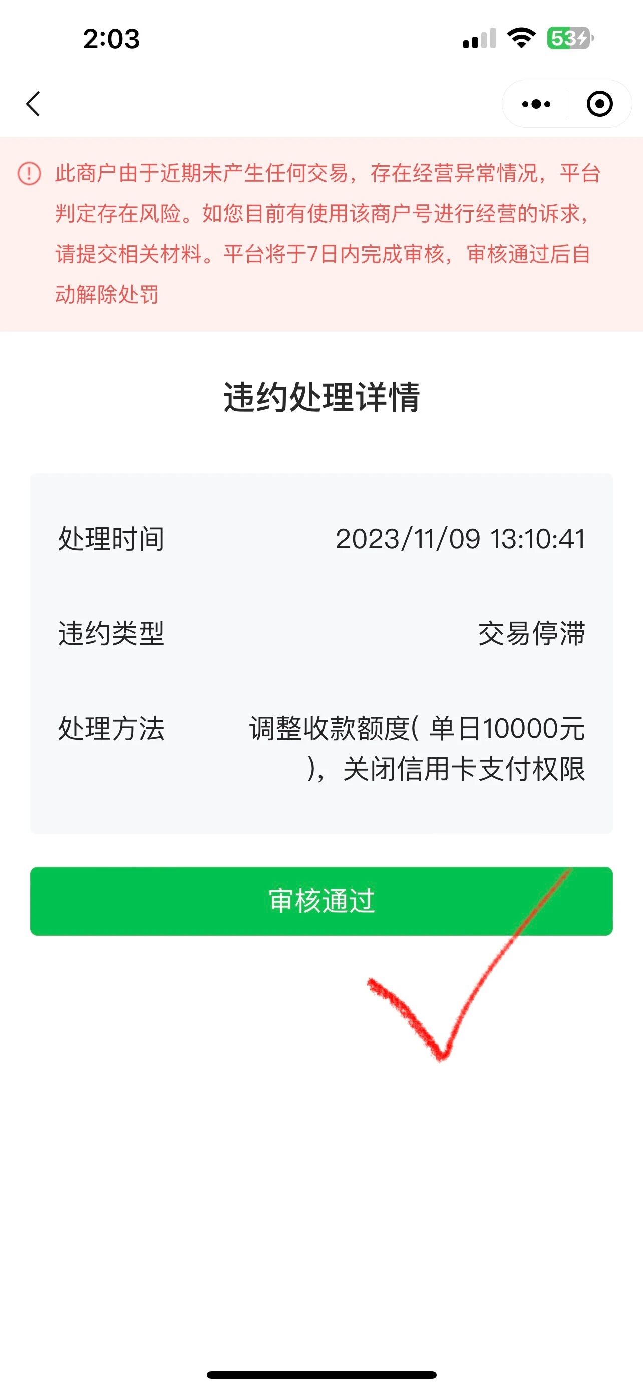 手机微信搜索:微信支付商家助手,点开微信支付商家助手小程序,进入你的商家助手页面,点击[风险处理】--【违约处理记录】--【申请审核】,1--3天即可审核通过✅。