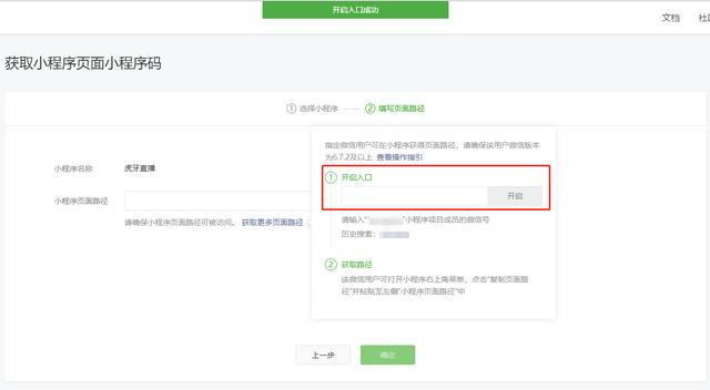 5.鼠标移动到“获取更多页面路径”,在弹出窗口输入当前登陆的小程序的任意开发者微信号,然后点击开启,出现顶部的“开启入口成功”就可以使用手机访问“虎牙直播”任意页面进行复制了