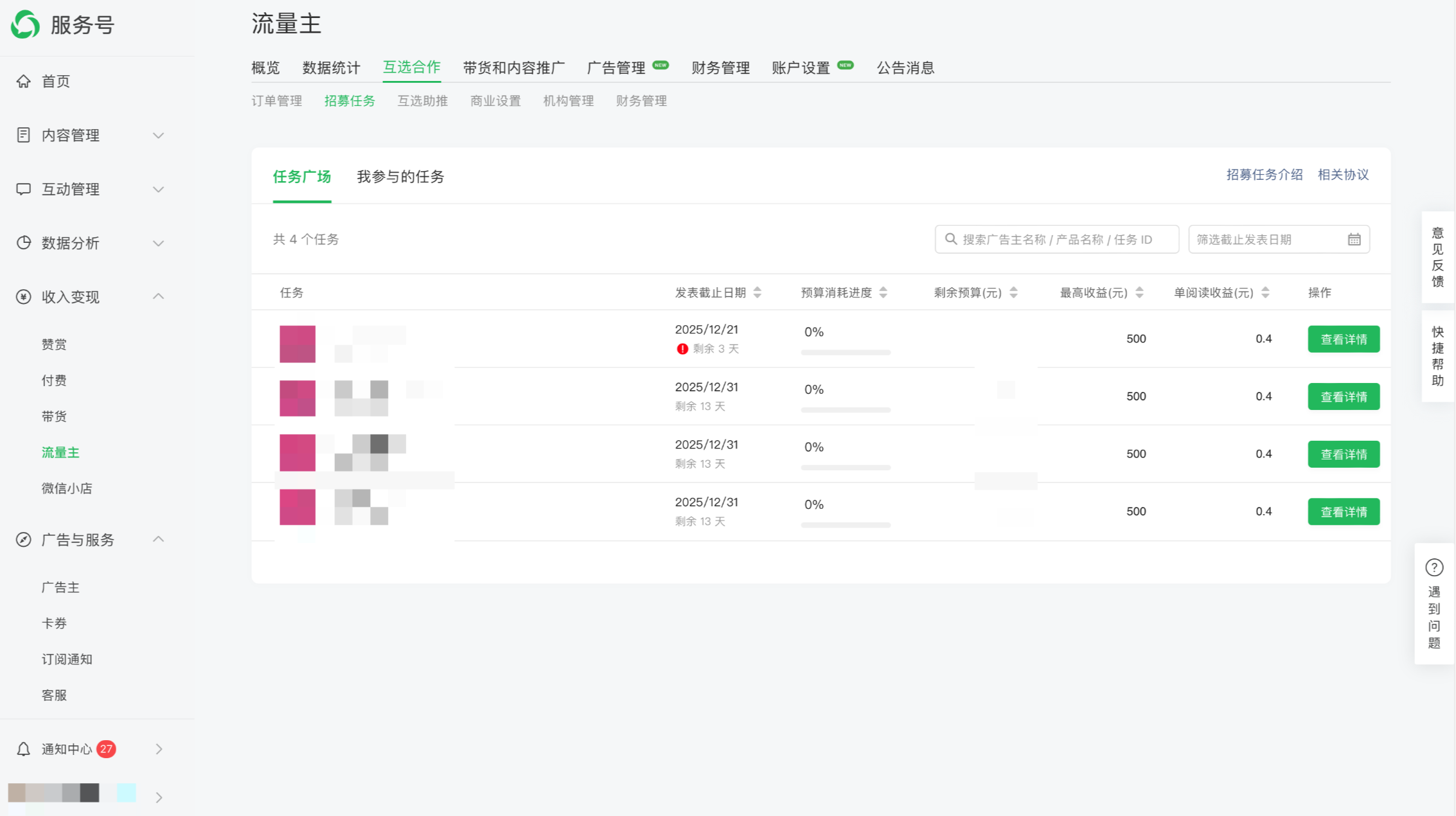 公众号招募任务为广告主和创作者提供新的合作模式,提升双方合作效率。广告主一次下单批量圈选创作者,平台对客户意向创作者派单。创作者根据广告主要求和收益规则参与创作,由平台进行文章审核后,由创作者进行文章发布,满足条件的文章可获得计算收益。