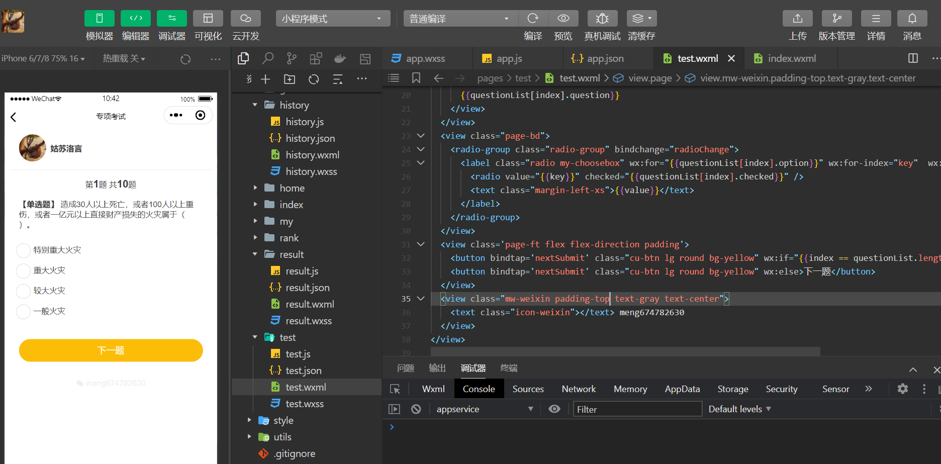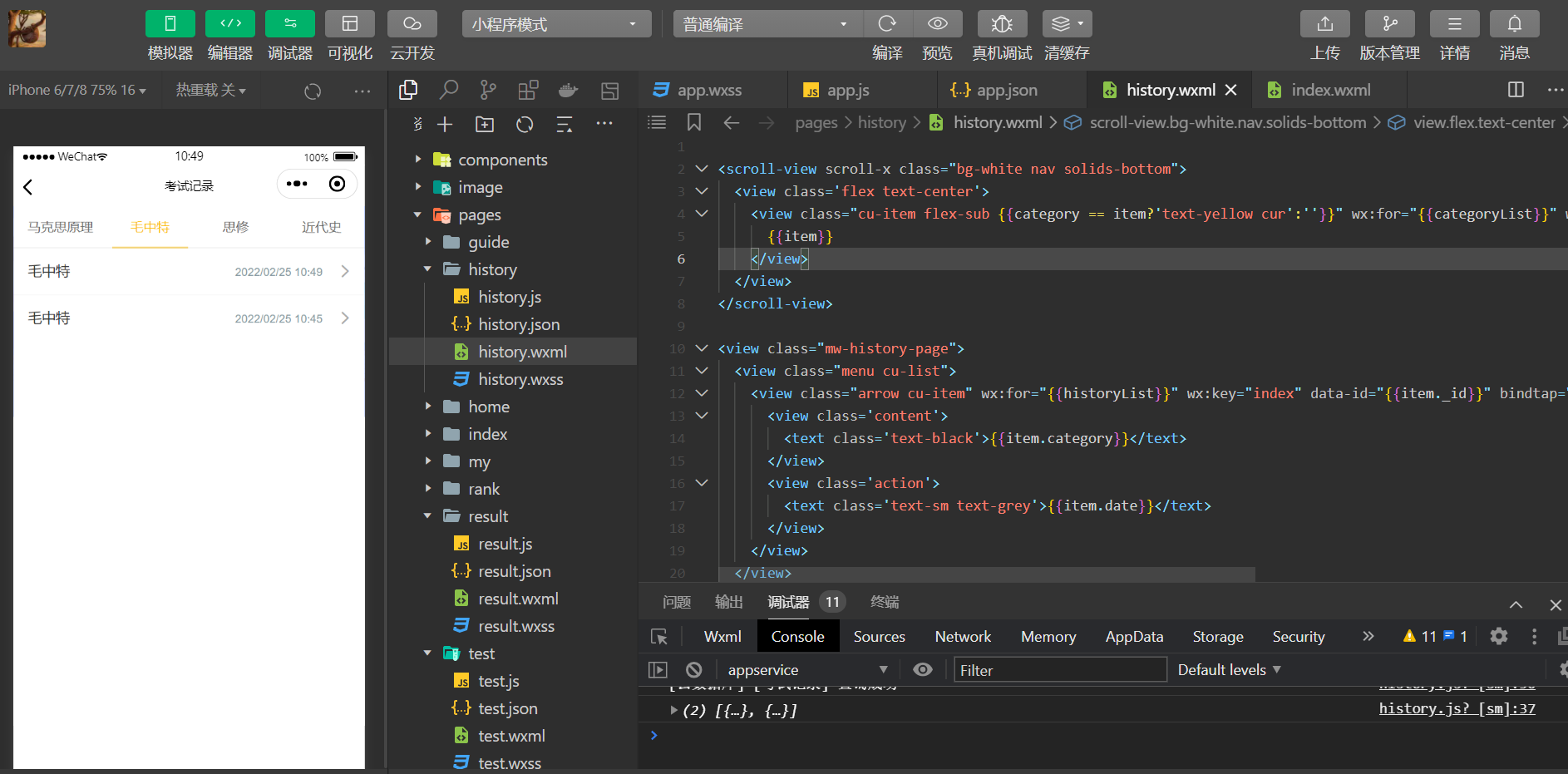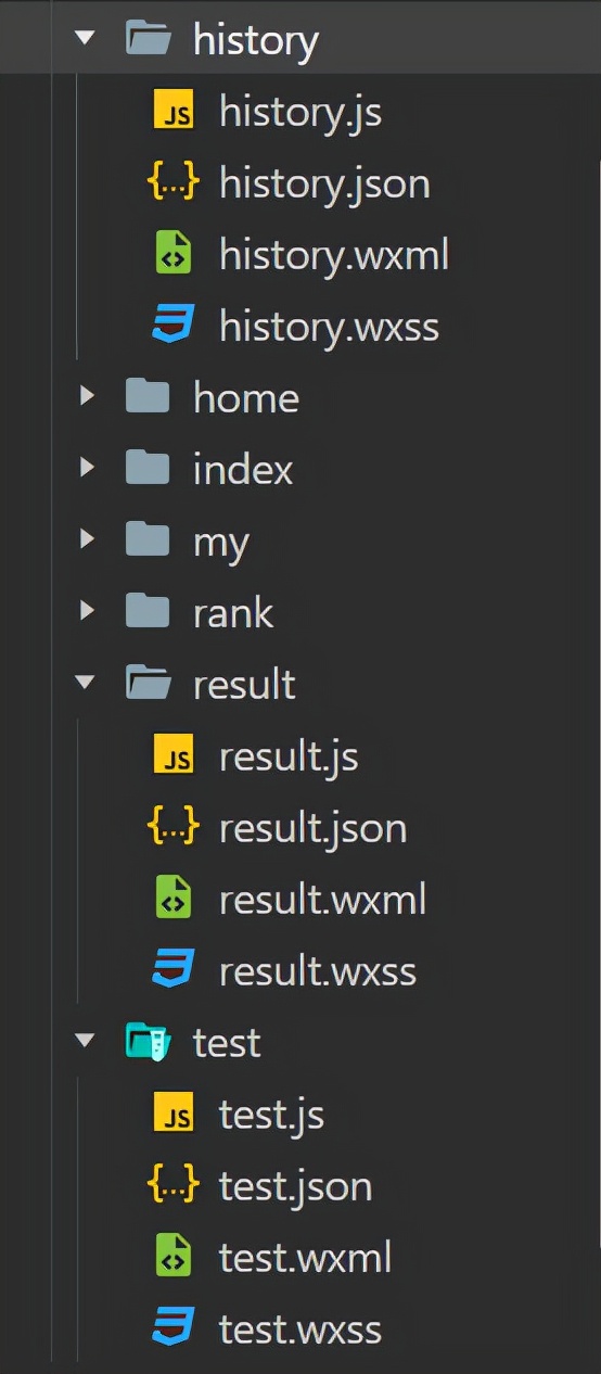 1.1、在pages文件夹中,分别创建三个文件夹test、result、history,分别对应三个页面答题页、结果页、答题记录页;
