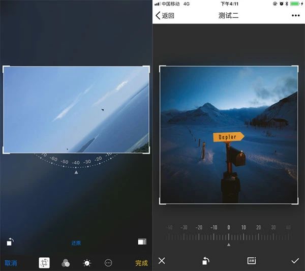 左侧是 IOS 系统相册中原生的图片裁剪功能,右侧为 SimpleCrop 移动端示例。