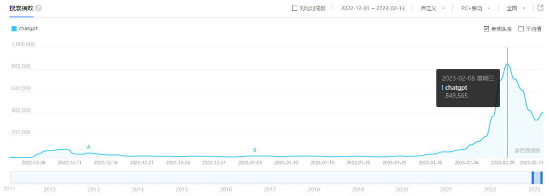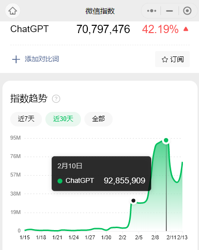 我们通过西瓜数据搜索发现,在 ChatGPT 用户破亿之后,也就是1月底开始,公众号上与之相关的文章内容开始飙升。