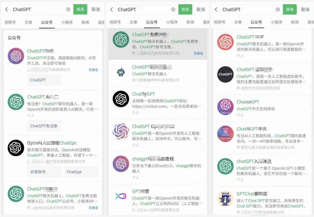 微信小程序、公众号也是如此,以“ChatGPT”为关键词命名,通过头像、LOGO等官方标识的更改,使用带有官方色彩的词汇来“迷惑”用户。