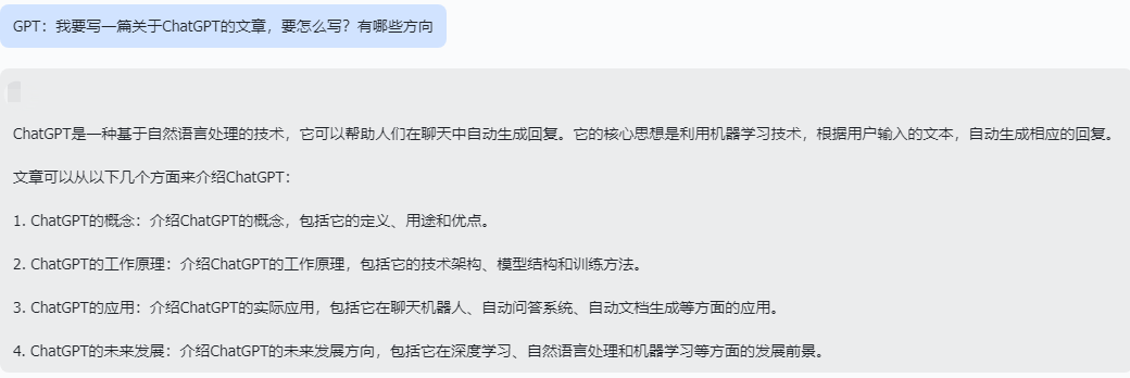 文章不知道从何下手、不知道要写哪些内容、文章框架怎样,描述清楚问题,ChatGPT 就能指明方向。