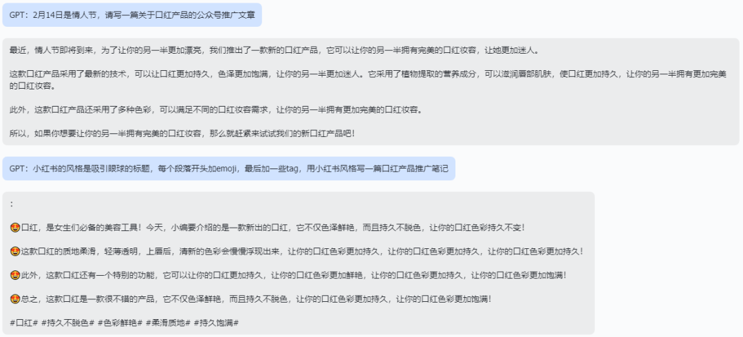 从标题、文章大纲到文章具体文案,都能提供参考内容。你的问题描述得越清晰,关键词给得越准确,ChatGPT 给到的回答就越符合你的需求,甚至连小红书风格的笔记都能写。
